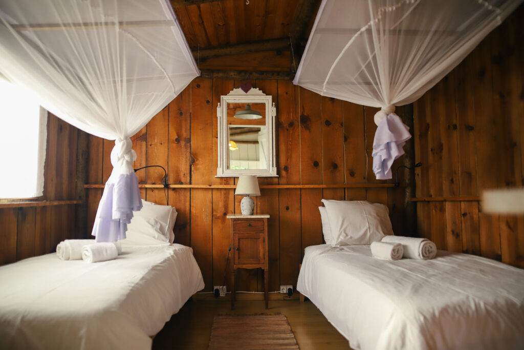 This wooden cabana has been renovated to be the cutest stay. It has two single beds, a separate private bathroom, and a kitchenette.
