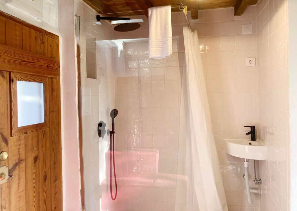 There’s a private shower, a separate toilet downstairs, and a cozy outside lounge (accessible to other guests from the garden).