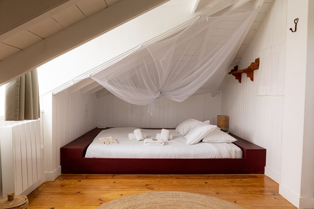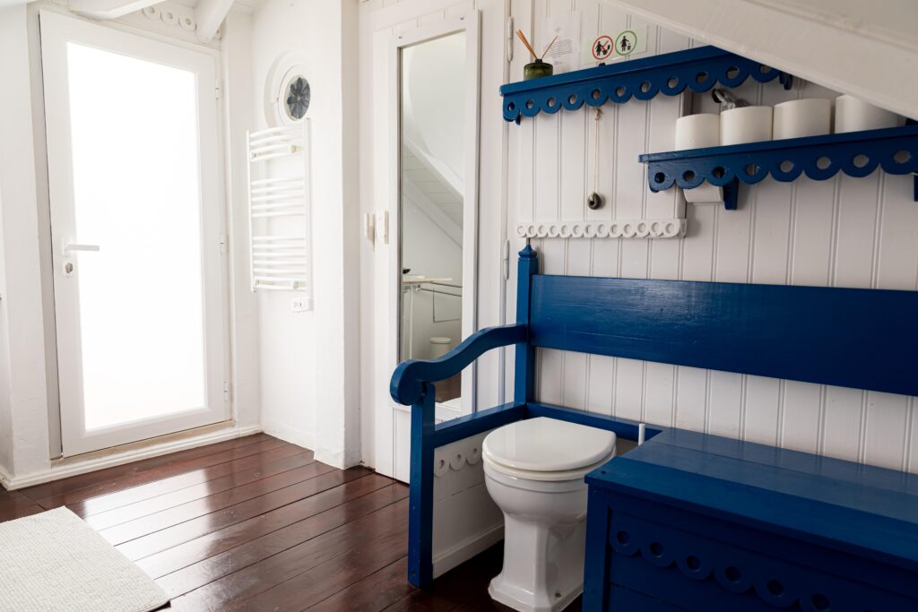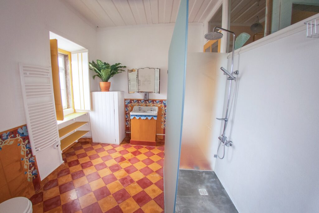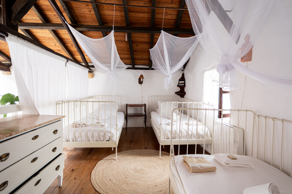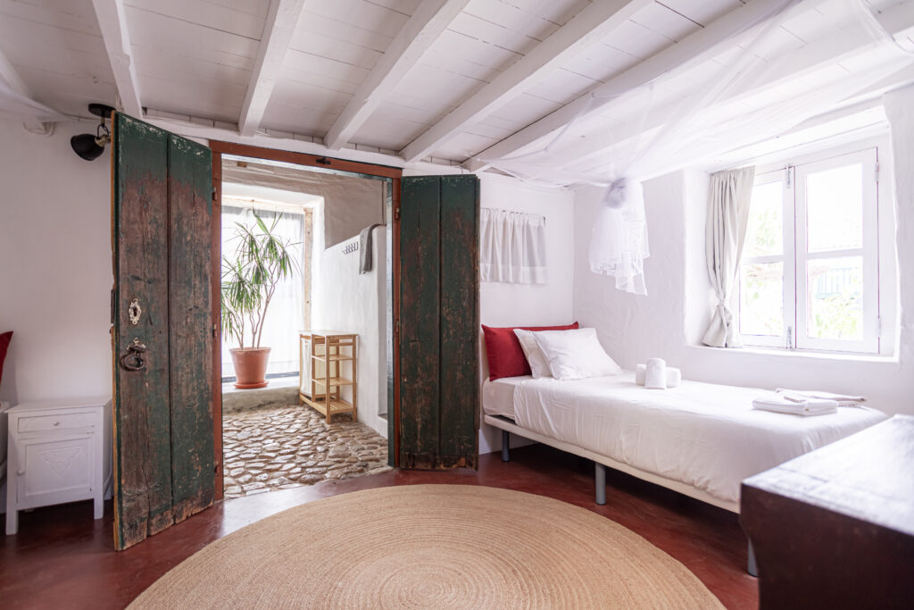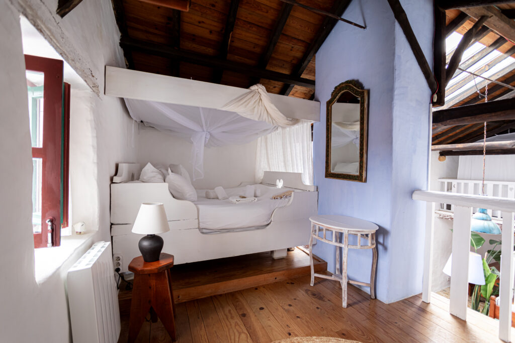Casa Palheiro – Our blue farmhouse, is a two-storey renovated rustic barn house that can accommodate up to four guests (one double bed at one end and three single beds at the other end, semi-separated by curtains).