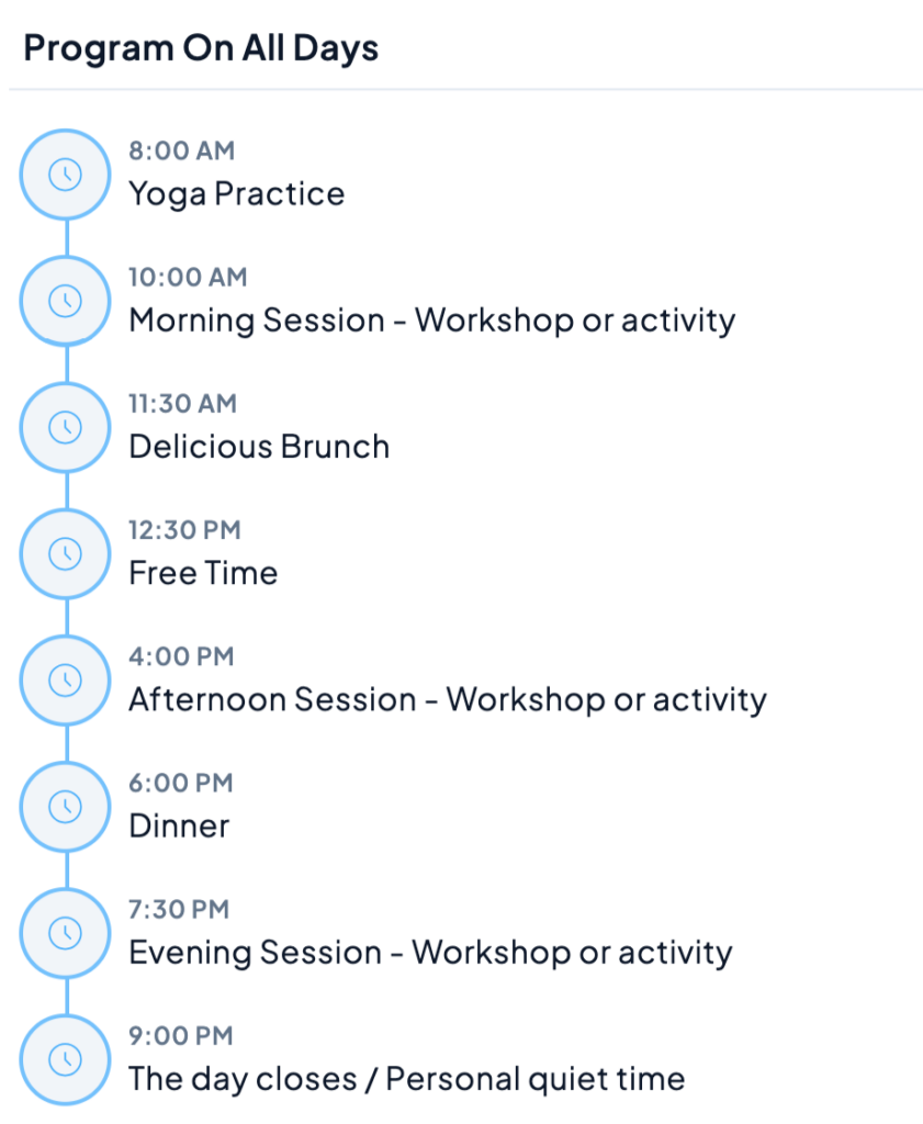 Whilst no part of the retreat is 100% obligatory, we will work through a specific program built to act as a wave during the 6 days. I actively encourage you to attend all activities to reap the benefits of the full experience.